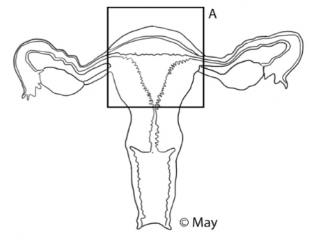 Die Extraktion des Gebärmutterkörpers erfordert eine Fragmentierung mit einem Instrument namens Morcellator, um den chirurgischen Teil durch kleine Schnitte zu extrahieren. Um die Bauchhöhle nicht zu verunreinigen, erfolgt diese Fragmentierung oft in einem in den Bauchraum eingeführten Schutzbeutel. (A)